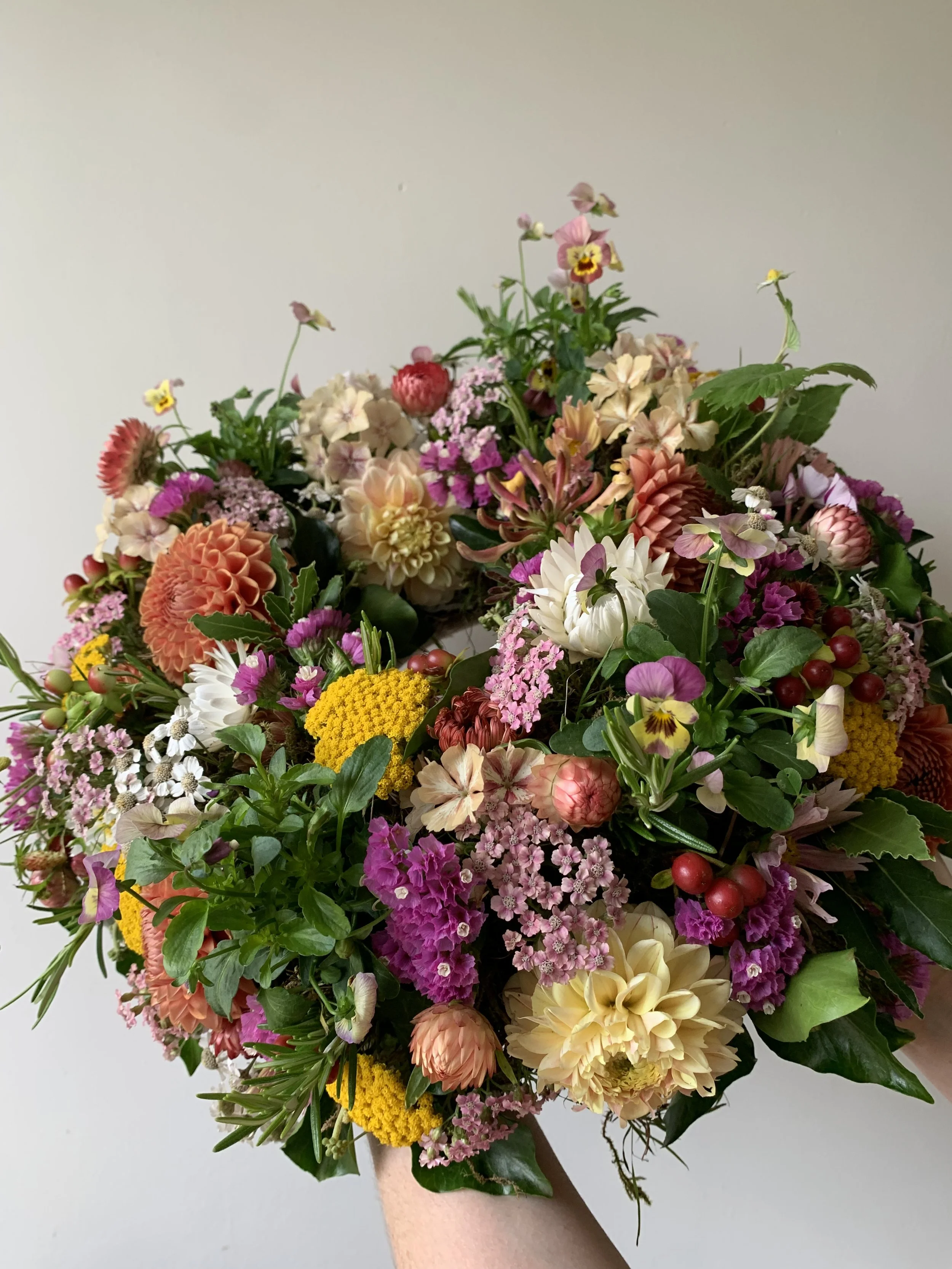 A garden inspired wreath constructed on a willow or wooden base. I use damp moss to keep the flowers hydrated which makes the wreath home compostable. Full of flowers and textured foliage. I can also incorporate living plants which can be replanted as a lasting tribute.