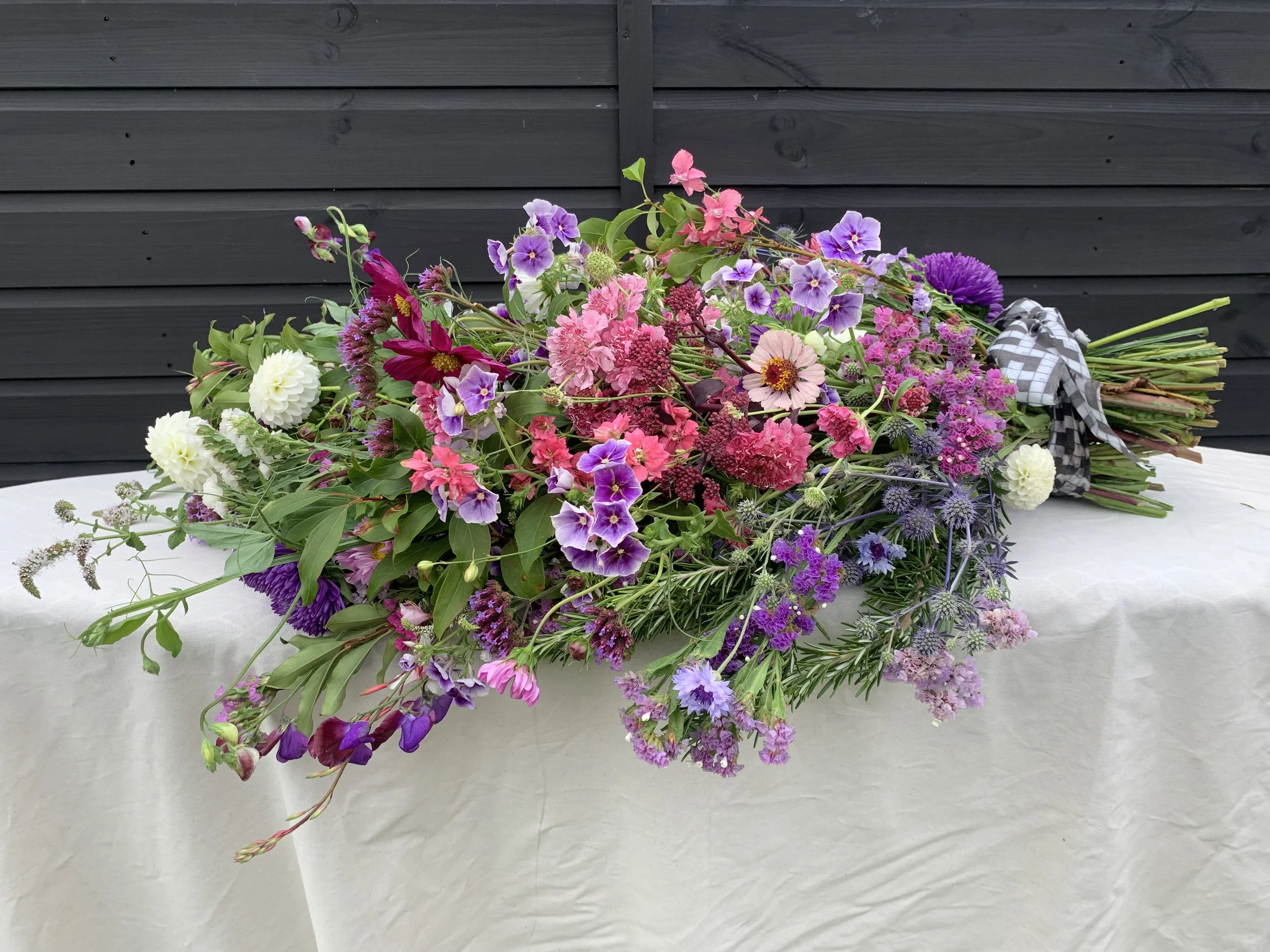 A celebration of your loved one’s life through flowers, I try to capture spirit and personality in my floral tributes. Rooted between the hedgerows and the sea I work alongside nature in my Sidmouth cutting garden to grow flowers full of movement and scent. Each arrangement is fully bespoke, designed after a conversation with you about your loved one, reflecting both their interests and the season and landscape. Send me an enquiry using the form below to start the conversation. Specialising in truly seasonal flowers and foliage means I work to your colour palette, embracing the rhythms and quirks of each month. I mostly use the flowers grown in my own Sidmouth cutting garden and when necessary sourced from other trusted local growers. I use sustainable mechanics, never floral foam. I like to design arrangements with a life beyond your loved one’s service, with larger pieces incorporating living plants which can be replanted to serve as a lasting tribute or separate out into posies to gift to family and friends.