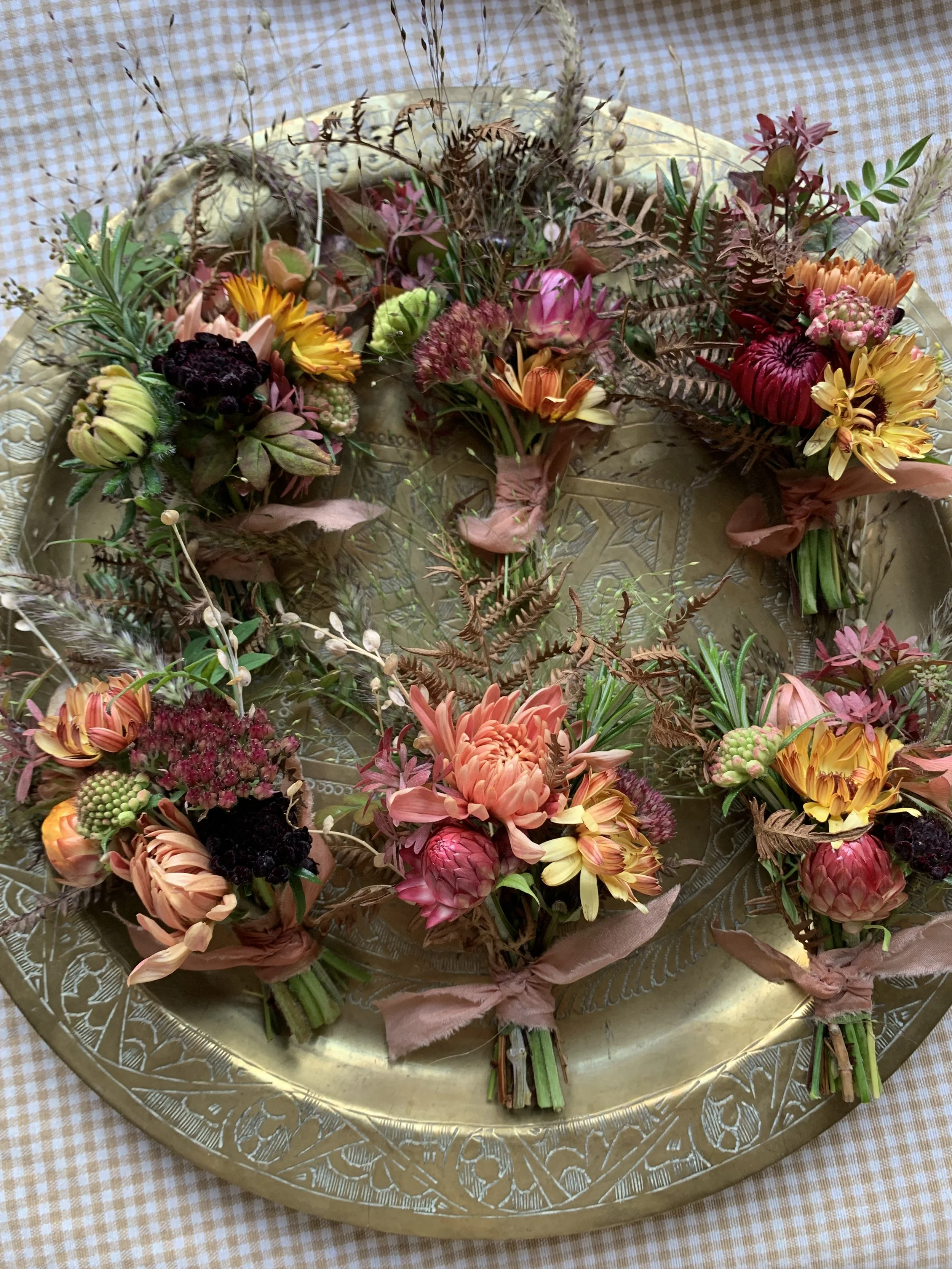 For artistic couples wishing to ensure the personal touch on their special day, my mixed buckets of flowers are a great way to involve family and friends in your day. Use them to create your table flowers and decorate your venue. A way to maximise impact from your floral budget, buckets include a mix of flowers, foliage and textural seed heads and berries. All cut on a best in bloom in the garden basis, let me know your preferred feature colours and I’ll incorporate these in to the mix. Flowers come conditioned with a full care guide and arranging tips and need to be collected from The Byes Blooms, Sidmouth.